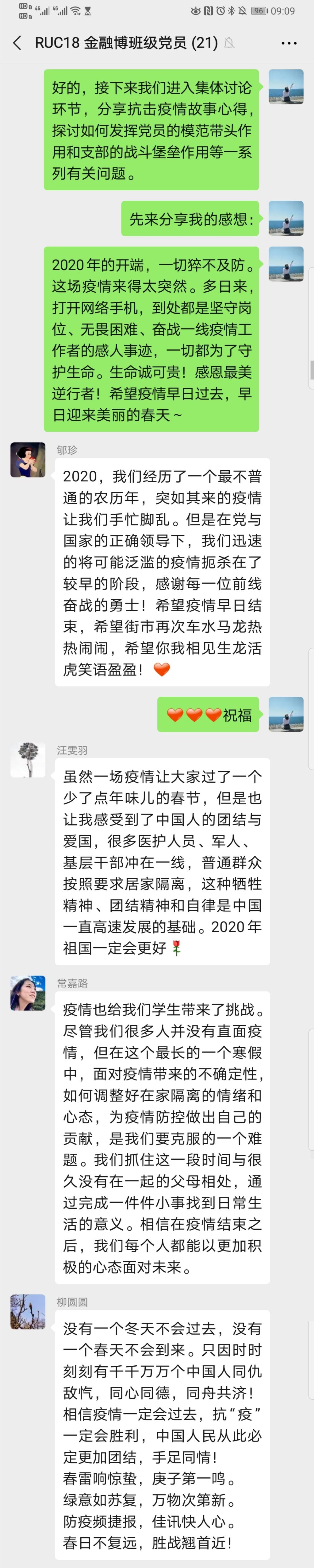 会议特殊的形式,让大家更聚焦于用文字和图片表达内心的真情实感,各抒己见。有的同学描绘了疫情期间自己和家人的心理状态及彼此相处的情形,有的结合新闻时事热点发表自己的看法,有的同学还通过吟诗作对来表达美好祝福,也有同学就回家后如何努力配合疫情防控工作展开描述,或从理论和实践相结合的角度,就党员如何发挥模范带头先锋作用的议题进行深入探讨,讨论在大家的火热参与下被推向高峰。