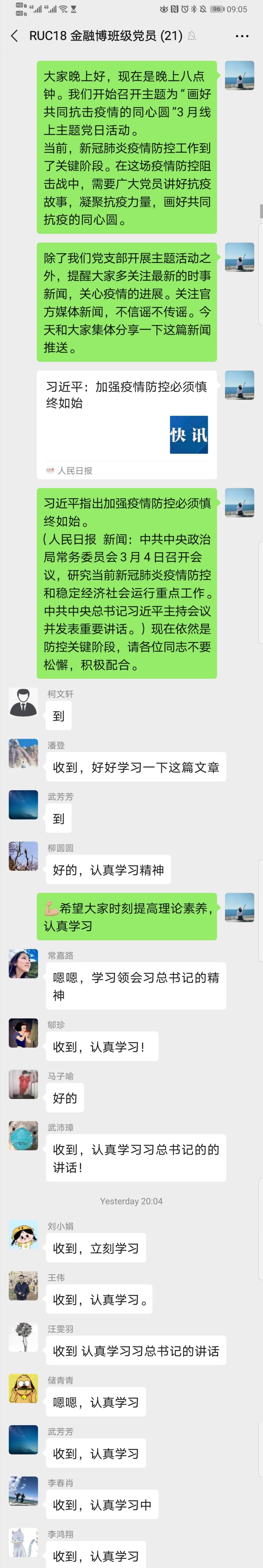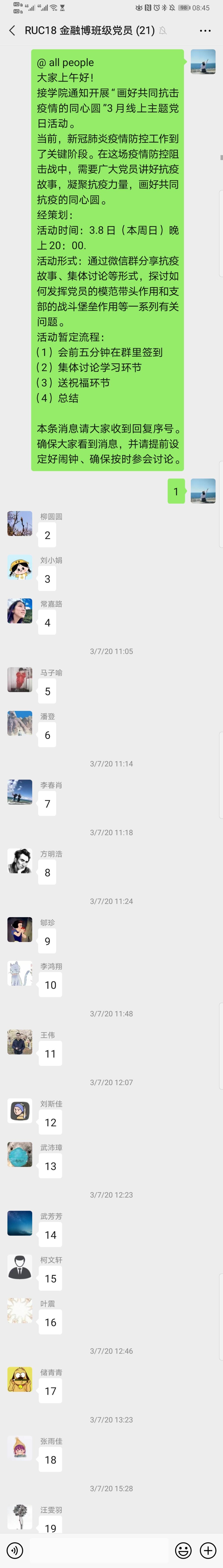 3月8日晚8点,2018级金融博士班党支部开展“画好共同抗疫情的同心圆”3月线上主题党日活动。全体党员签到参与讨论,在新冠肺炎的关键决胜时期,一同畅谈党员在这场战役中的重要角色和作用。从自身出发,讲抗疫故事,送抗疫祝福。