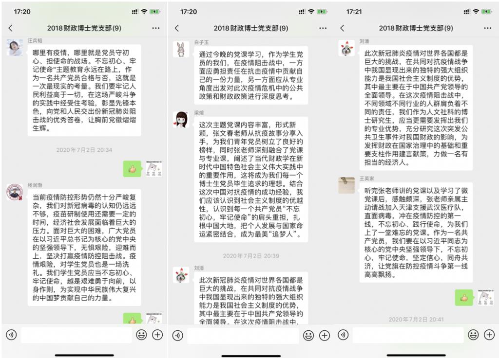 为贯彻落实党中央关于常态化疫情防控的决策部署,充分发挥高校基层党组织战斗堡垒作用和师生党员先锋模范作用,让党旗始终高高飘扬在疫情防控、返校复学、事业发展全过程全方位,在上级党委的统一安排部署下,2018级财政博士支部组织开展了“迎七一、庆祝建党99周年”7月线上主题党日活动。活动于2020年7月2日19:30开始,由党支部书记刘春阳主持。