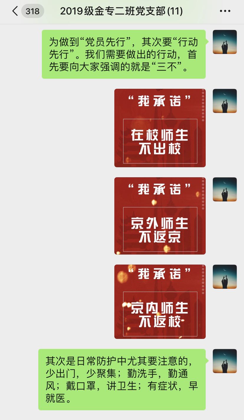 支部党员同志们也纷纷表示,信心是渡过难关的重要法宝,我们虽然做不了“战斗员”,不能在一线参与疫情阻击战,但我们同样可以为抗击疫情作出贡献,做好“宣传员”、“监督员”,坚信这场战斗必能胜利,积极鼓舞家人、朋友和同学,做好防控。相信在习近平总书记和党中央的坚强领导下,一定可以打赢这场不见硝烟的战“疫”!