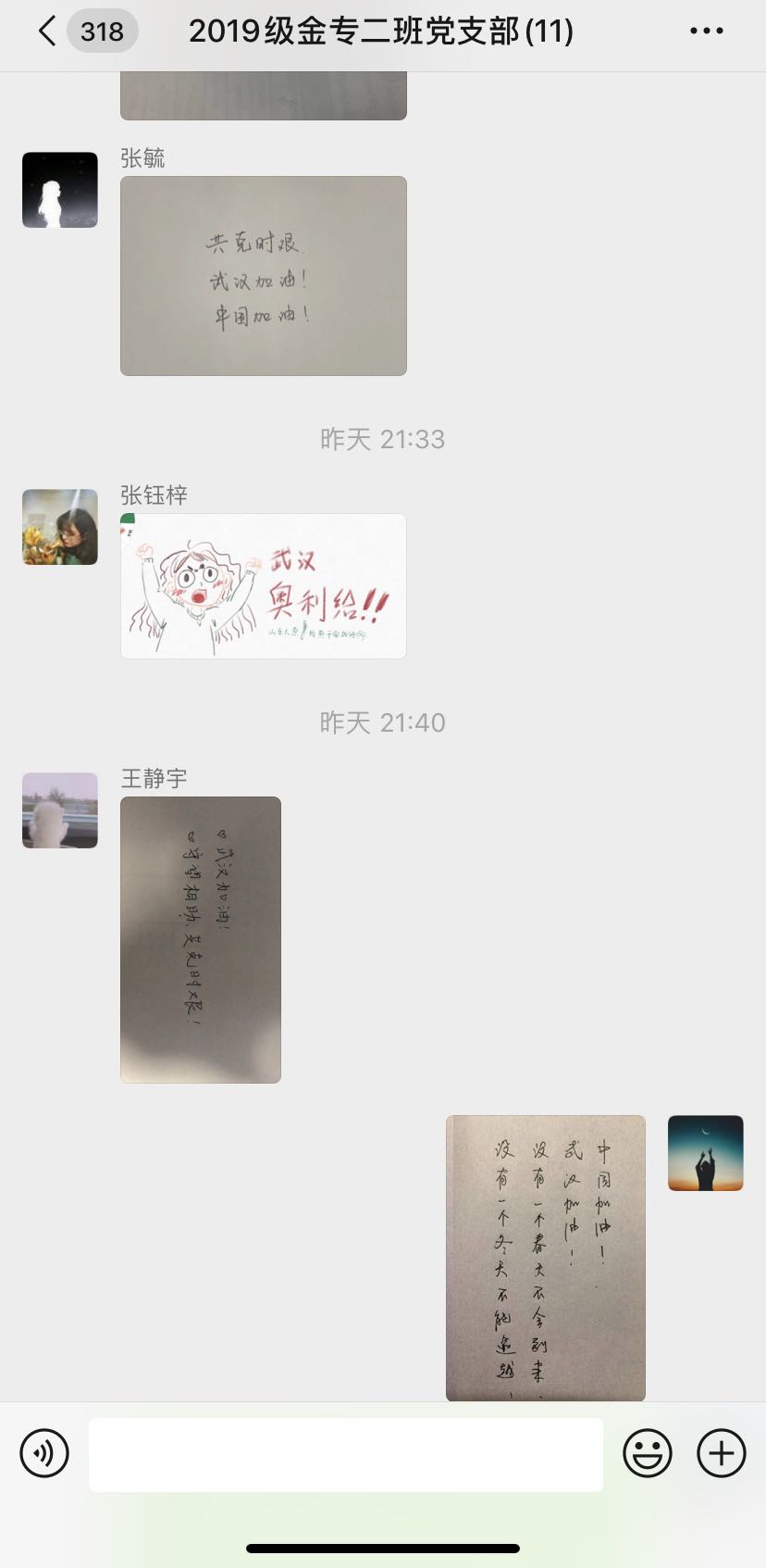 党课的最后,支部全体党员同志纷纷写下了自己的祝福,“风雨同舟 共渡难关”、“共克时艰 武汉加油”、“没有一个冬天不能逾越,没有一个春天不会到来”…一条条祝福都饱含着与祖国和人民同在的担当以及同心抗“疫”、战“疫”必胜的信心。本次线上党课凝聚了共识与力量,强化了党员同志的责任意识和奉献精神,在大家“武汉必胜、中国必胜”的声援中圆满结束。