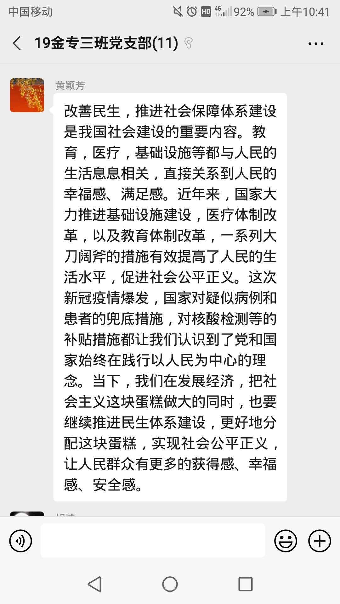 会议开始,9名党员同志将自己对于《习近平谈治国理政第三卷》的学习心得发到支部群内,互相交流学习。《习近平谈治国理政第三卷》共有十九个章节,9名党员同志分别就“决战脱贫攻坚”、“坚持以人民为中心”、“铸就中华文化新辉煌”、“提高保障和改善民生水平”、“完善和发展我国国家制度和治理体系”、“推动共建‘一带一路’走深走实”、“谱写新时代中国特色社会主义新篇章”、“推动经济高质量发展”八个章节发表了自己的学习体会。在对以上章节的交流讨论中,同学们既提到了与相关专题相关的理论知识,也提到了党和国家在这些方面所做的实事,无论是脱贫攻坚,还是改善民生,党和国家始终将人民放在第一位,坚持发展为了人民、发展依靠人民。