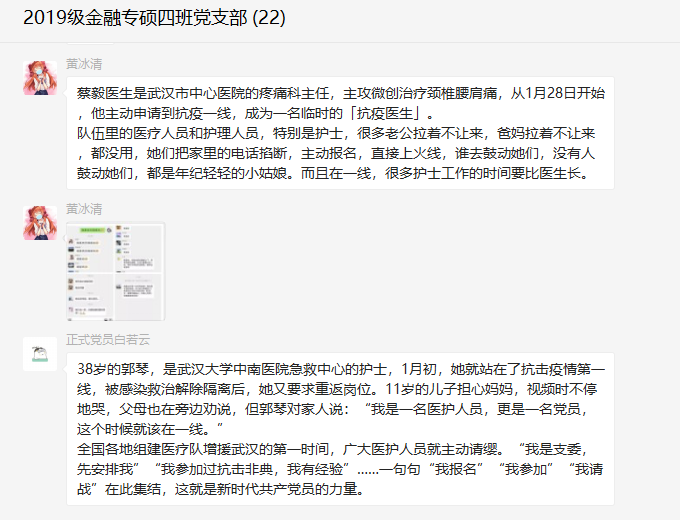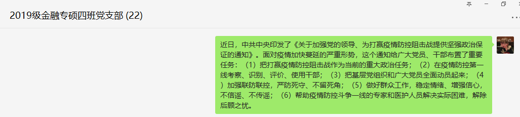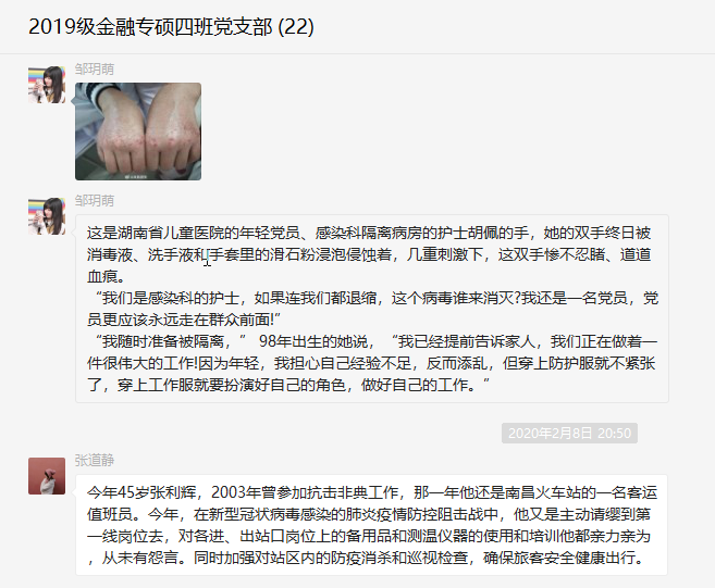 响应上级党委号召,2019级金融专硕四班党支部于2月8日在微信群中举办“抗击疫情,党员先行”线上党日活动。
