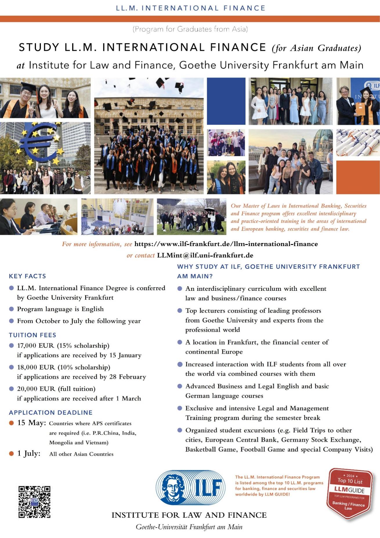 德国法兰克福歌德大学(Goethe University Frankfurt am Main)是法兰克福唯一一所综合性公立大学。法律与金融学院(Institute for Law and Finance,简称ILF)由法兰克福歌德大学于2002年成立,为国际留学生提供全英语的法学硕士(LL.M.)项目。凭借法兰克福作为欧洲大陆金融中心的环境优势,ILF已成为欧洲法律与金融领域学术交流的重要平台之一。法兰克福歌德大学法律与金融学院与欧洲中央银行、德意志联邦银行、德国银行、德国商业银行、德国证券交易所、全球顶级律师事务所、四大会计师事务所及国际知名企业合作,为优秀学生及行业佼佼者提供学术交流与实践的平台,是欧洲法律及金融领域精英人才的培育摇篮。2014年10月学校专为来自亚洲的留学生开设了国际金融法学硕士 (LL.M. International Finance) 项目。近几年,学院已将该项目推广至中国及亚洲的高校并与部分高校法学院、金融学院、财经学院和商学院签订了合作协议。