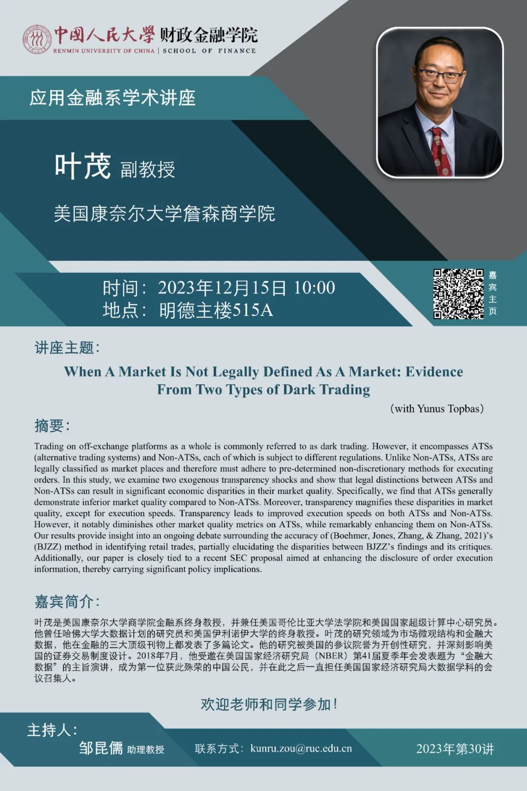 讲座预告 | 应用金融系学术讲座:美国康奈尔大学詹森商学院叶茂副教授