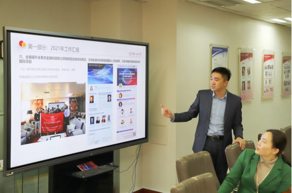 首先,钱宗鑫对学院2021年整体的国际交流工作做汇报。从国际伙伴交流与合作、国际会议、海外宣传、外事服务与管理、国际学生管理、全英文金融科技项目等方面介绍了学院过去一年的的成果和成绩。钱宗鑫指出,2022年,学院将继续做好全方面的国际交流与合作,努力提升海外宣传水平,开拓新的国际合作伙伴与合作模式,并打造世界一流水平的金融学科类全英文项目。