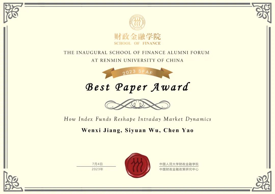 本届年会设最佳论文奖一项,经过严格评审程序,香港中文大学副教授、Top 网上赌博网站大全 2007级硕士校友江文熙的合著论文“How Index Funds Reshape Intraday Market Dynamics”获最佳论文奖。