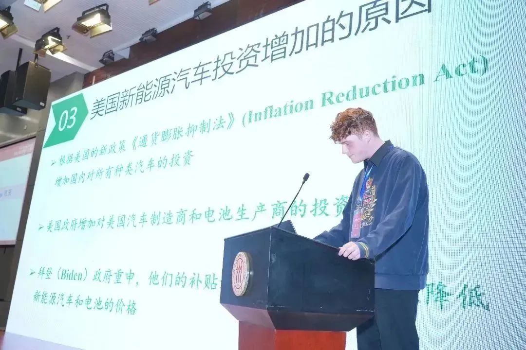 上半场,来自哥伦比亚大学的Skyler Standridge同学着眼于汽车电气化现象,分析了国际上对新能源汽车投资的增加所带来的影响;来自上海财经大学的褚昭楠同学回顾了新兴市场国家在近几十年与国际市场深度嵌合过程中所遇到的汇率制度选择困境有关理论与经验,论述了国际货币体系改革的重要性;来自布兰戴斯大学的Simon Eber同学介绍了人民币国际地位提高对美元的影响,论证了去美元化的未来走势;来自中央财经大学的洪斯佳同学对中美绿色金融合作的意义、机制、实践与展望进行了深入分析;来自华盛顿大学的Isaac Volk同学围绕新兴经济体去美元化进行了全面的阐释;来自中国人民大学的雷昌琳同学从实践角度对中美两国在绿色金融创新领域的合作机遇进行了分析,并提出政策建议;来自布朗大学的Laura Romig同学从多方面论证了智慧农业的优势,并分析了其未来发展将会面临的问题;来自中国人民大学的林焰同学分析了中美金融治理合作推动经济高质量发展的内在逻辑及主要机制,并对中美资本市场互通前景进行了探讨;来自圣母大学的Finn Meffe同学和来自范德堡大学的William Hemond同学以俄乌战争对国际形势的影响为切入点,分析了俄乌冲突和一带一路对中美经济地位的影响。