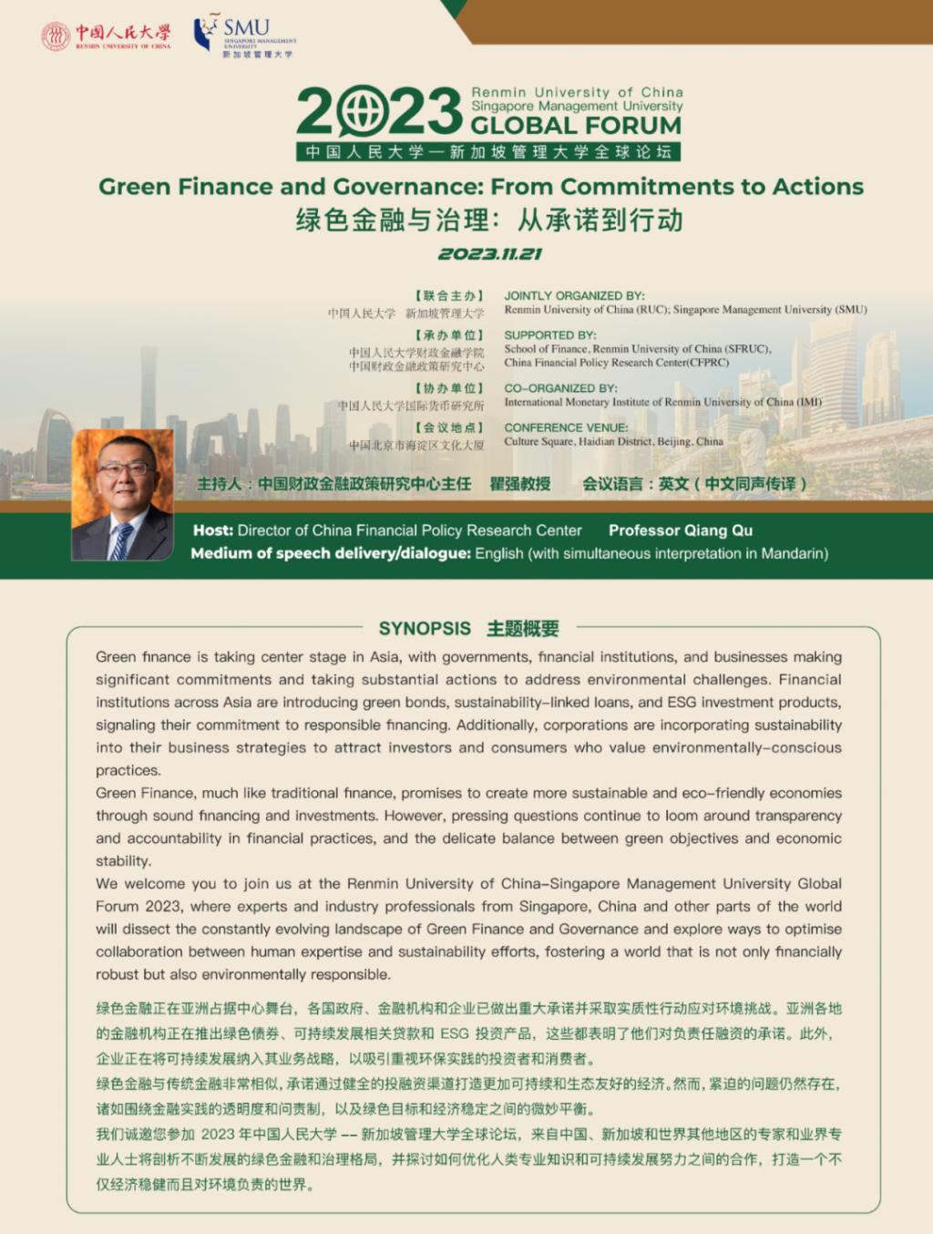 4. 11月21日,“中国人民大学—新加坡管理大学全球论坛”在北京成功举行,主题为“绿色金融与治理:从承诺到行动”。