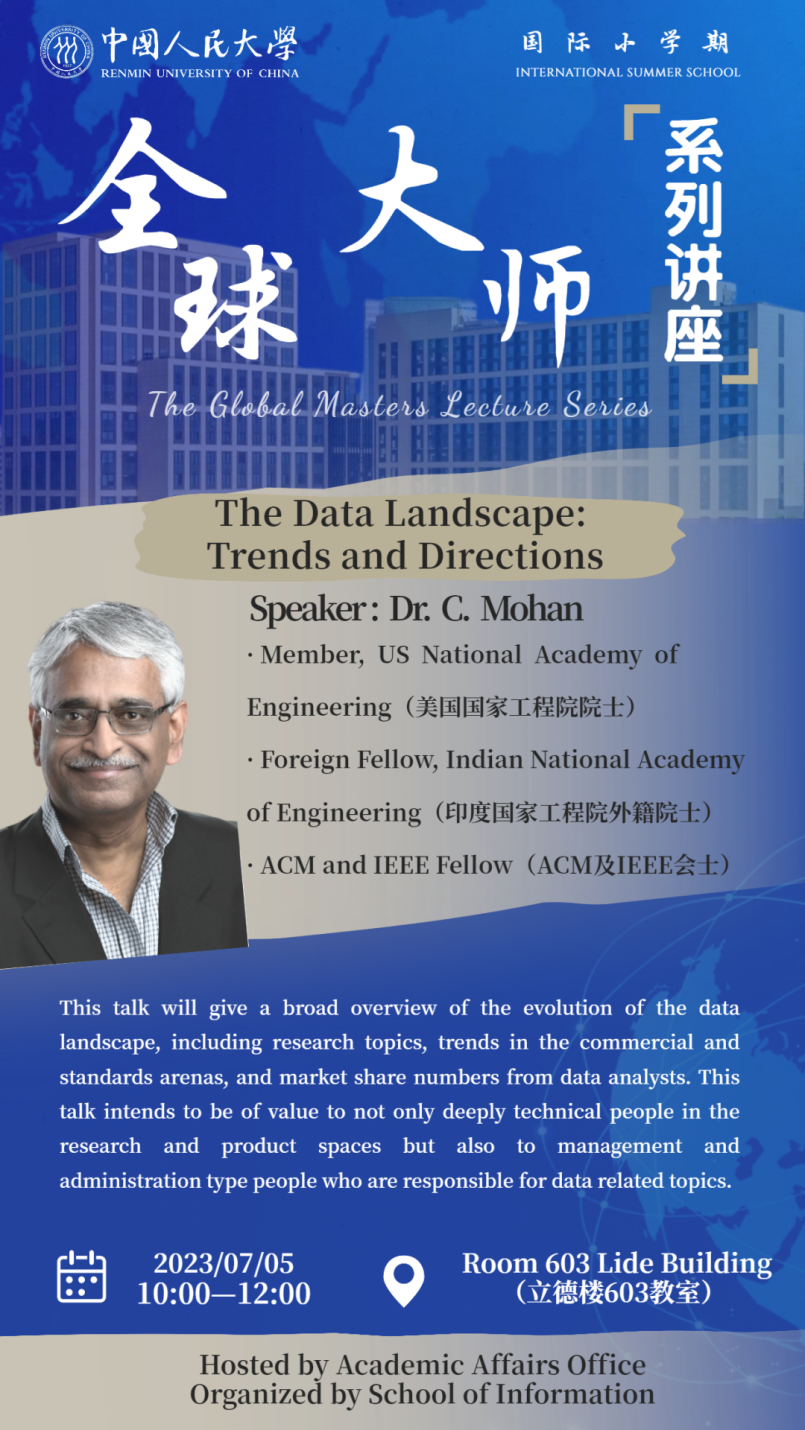 为推动计算机学科发展,信息学院组织了两次全球大师系列讲座。首先邀请到C. Mohan教授。 C. Mohan教授是美国国家工程院院士,清华大学杰出访问教授,IBM印度首席研究员。Mohan教授曾获得 ACM SIGMOD Edgar F. Codd Innovations Award和 VLDB 10 Year Best Paper Award。Mohan教授所提出的ARIES方法被广泛用于数据库管理系统中,也是数据库教科书中的经典算法。此外,还邀请到约翰·霍普克罗夫特(John Edward Hopcroft)教授。约翰·霍普克罗夫特(John Edward Hopcroft)教授1986年图灵奖获得者,现任北京大学访问讲席教授、前沿计算研究中心主任,美国康奈尔大学计算机科学系工程与应用数学荣休教授。先后当选美国艺术与科学院、美国国家工程院和美国国家科学院院士;2017年,当选中国科学院外籍院士。