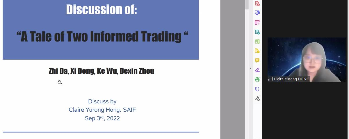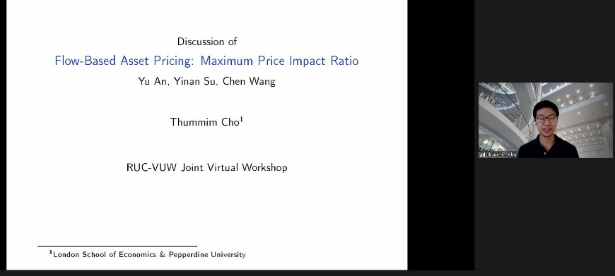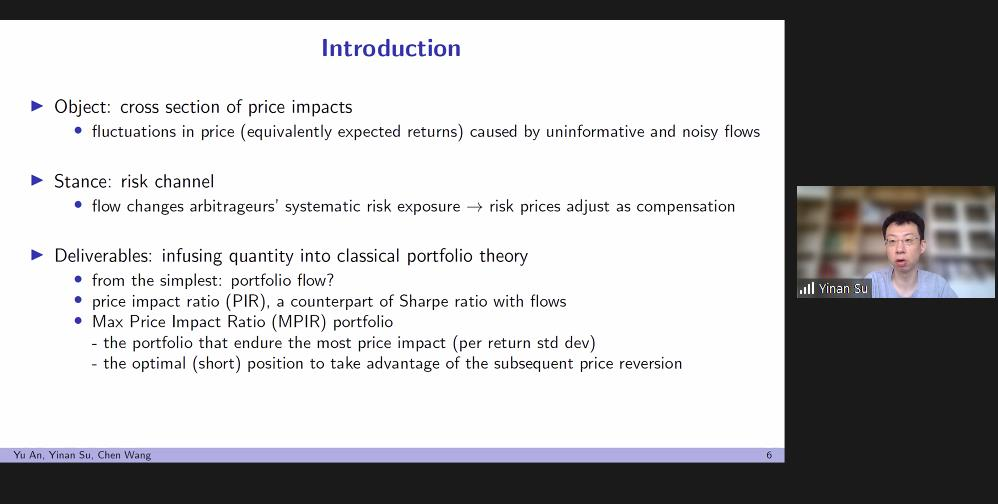 上午会议的第一部分。来自约翰斯霍普金斯大学的Yinan Su、康奈尔大学的Yifei Mao展示了论文。Yinan Su题为Flow-Based Asset Pricing: Maximum Price Impact Ratio的文章发现非信息流的价格影响作为边际投资者的风险补偿而产生,在给定的基本风险水平下,做空能产生最大价格影响的投资组合是最有效的反流动交易策略。伦敦政经学院的Thummim Cho对这篇论文进行了点评。Yifei Mao题为Resurrecting Dead Capital: The Sharing Economy, Entrepreneurship, and Job Creation的文章以爱彼迎的渗透程度作为共享经济和风险资本发展的代理变量,发现爱彼迎对当地企业的创建具有刺激作用,为研究共享经济的实际影响提供了新的视角。岭南大学的Lai Wei对这篇文章进行了点评。