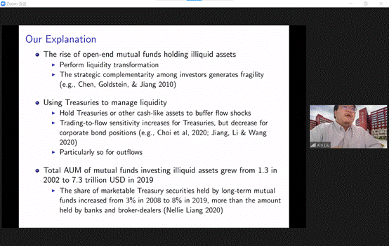 简短的休息与讨论后,香港大学的黄诗杨老师做了题为An Anatomy of Government Bond Trading during the COVID-19 Crisis的主题报告。报告利用新冠疫情期间英国债券市场的数据(ZEN数据库)来研究政府债的交易情况。报告指出,在新冠疫情期间,共同基金、保险公司和养老基金需求流动性,而对冲基金和银行提供流动性。由于流动性的需求方在2020年3月10日至18日期间大量出售政府债以换取流动性更高的现金,政府债的价格在此期间迅速下跌,而流动性的供给方的交易则对其没有显著的影响。研究结果显示共同基金、保险公司和养老基金是造成政府债价格震荡的一个原因。