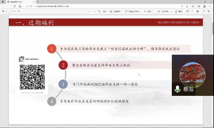 随后,蔡老师结合最新就业政策介绍了学院近期“就业福利”,包括建立“财金22届就业助力群”,精准推送就业岗位;整合学院资源支持线上面试;专门开放面向2022届毕业生的一对一咨询以及科研助理和行政助理岗。蔡老师建议对考研二战把握并不大的同学静下心来认真分析一下,重新进行下一轮评估和规划,抓住剩下的小的黄金周期,努力找到自己合适的工作。