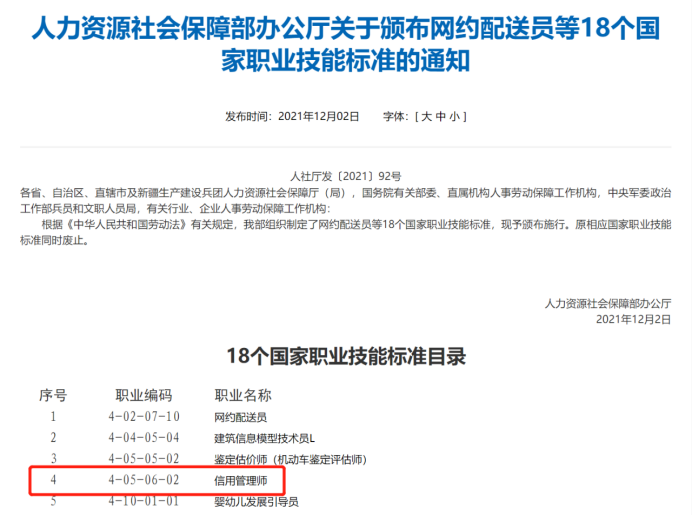 《信用管理师国家职业技能标准(2021年版)》以“职业活动为导向、职业技能为核心”为指导思想,对企业信用管理和征信从业人员的职业活动内容进行规范的细致描述,对各等级从业者的技能水平和理论知识水平进行了明确规定。该《标准》依据有关规定将本职业分为四级/中级工、三级/高级工、二级/技师和一级/高级技师。