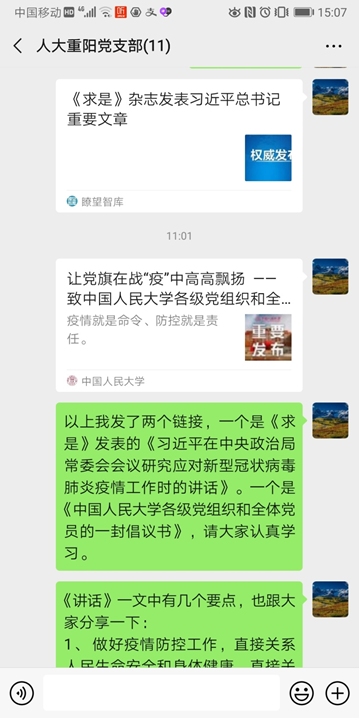 时间:2020-02-17根据上级党委部署,经支委会讨论决定,中国人民大学重阳金融研究院(人大重阳)党支部于2020年2月17日上午组织开展“抗击疫情,党员先行”线上主题党日活动。支部党员在积极学习相关疫情防控文件的同时,也各自通报了目前的状况,并阐述作为智库的党员,面对特殊的疫情期,在工作中发挥模范带头作用,切实做好各项工作,抗击疫情的相关情况。本次会议由人大重阳党支部副书记杨云涛主持。
