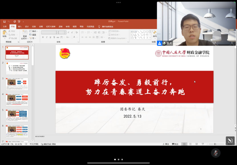 在此次团课中,秦天老师向同学们深刻解读了习近平总书记在庆祝中国共产主义青年团成立100周年大会上、在中国人民大学考察时的两次重要讲话精神,强调同学们要坚定不移跟党走,为党和人民奋斗,激荡青春力量。他结合具体实例,与支部成员讨论了“为谁培养人,培养什么样的人,怎样培养人”的问题,指出青年要把自己培养成革命的先锋分子,要不怕困难、脚踏实地,富有实践精神。他还带领支部成员回顾了中国共产主义青年团的百年历程,并鼓励同学们要树立远大理想、热爱伟大祖国,担当时代大任,让青春在新时代的广阔天地中绽放。最后,秦天老师总结道:立足新时代新征程,身为人大学子,更应该从实践出发,以问题为导向,不断磨练自身的能力;更应该牢记党的教诲,立志民族复兴,不负韶华,不负时代,不负人民!