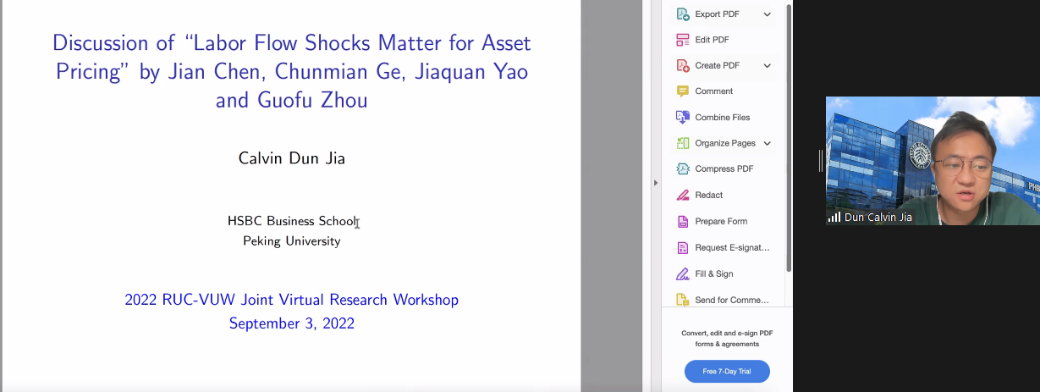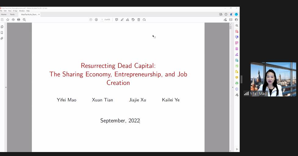 上午会议的第一部分。来自约翰斯霍普金斯大学的Yinan Su、康奈尔大学的Yifei Mao展示了论文。Yinan Su题为Flow-Based Asset Pricing: Maximum Price Impact Ratio的文章发现非信息流的价格影响作为边际投资者的风险补偿而产生,在给定的基本风险水平下,做空能产生最大价格影响的投资组合是最有效的反流动交易策略。伦敦政经学院的Thummim Cho对这篇论文进行了点评。Yifei Mao题为Resurrecting Dead Capital: The Sharing Economy, Entrepreneurship, and Job Creation的文章以爱彼迎的渗透程度作为共享经济和风险资本发展的代理变量,发现爱彼迎对当地企业的创建具有刺激作用,为研究共享经济的实际影响提供了新的视角。岭南大学的Lai Wei对这篇文章进行了点评。