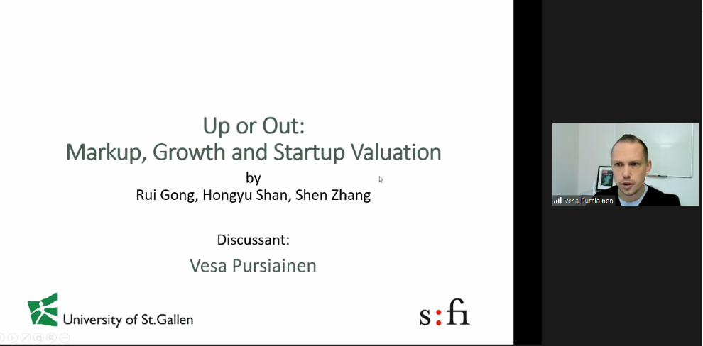 下午会议的第一部分。来自惠灵顿维多利亚大学的Jinji Hao、中欧国际工商学院的单宏宇分享了论文。Jinji Hao题为The Cross-Section of Expected Total Housing Returns的文章研究了预期住房总收益的截面决定因素,发现了显著的价值效应、动量效应和逆转效应。山东大学的张群姿点评了这篇论文。单宏宇题为Up or Out:Markup,Growth and Startup Valuation的文章研究了企业如何在盈利能力、增长和估值等战略目标中平衡,讨论了使得企业估值接近其盈利能力的条件。圣加仑大学的Vesa Pursiainen点评了这篇文章。