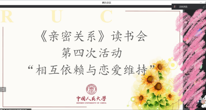 4月18日至5月23日每周一晚的4次读书会,全体成员均先开展例行的破冰活动,不断加深对彼此的认识和连接。随后每次读书会,在读书会带领者引导下,成员依次交流“人际关系”与“友谊”,“吸引力”与“社会认知”,“爱情”、“相互依赖”与“亲密关系的维持和修复”,“压力与紧张”、“冲突”与“沟通”等书籍章节的阅读感想,就自身的依恋类型、友谊的终身变化、自身恋爱模式、维护恋爱的技巧、亲密关系中的紧张情况与沟通技巧等多个切身相关的话题进行了交流与分享。