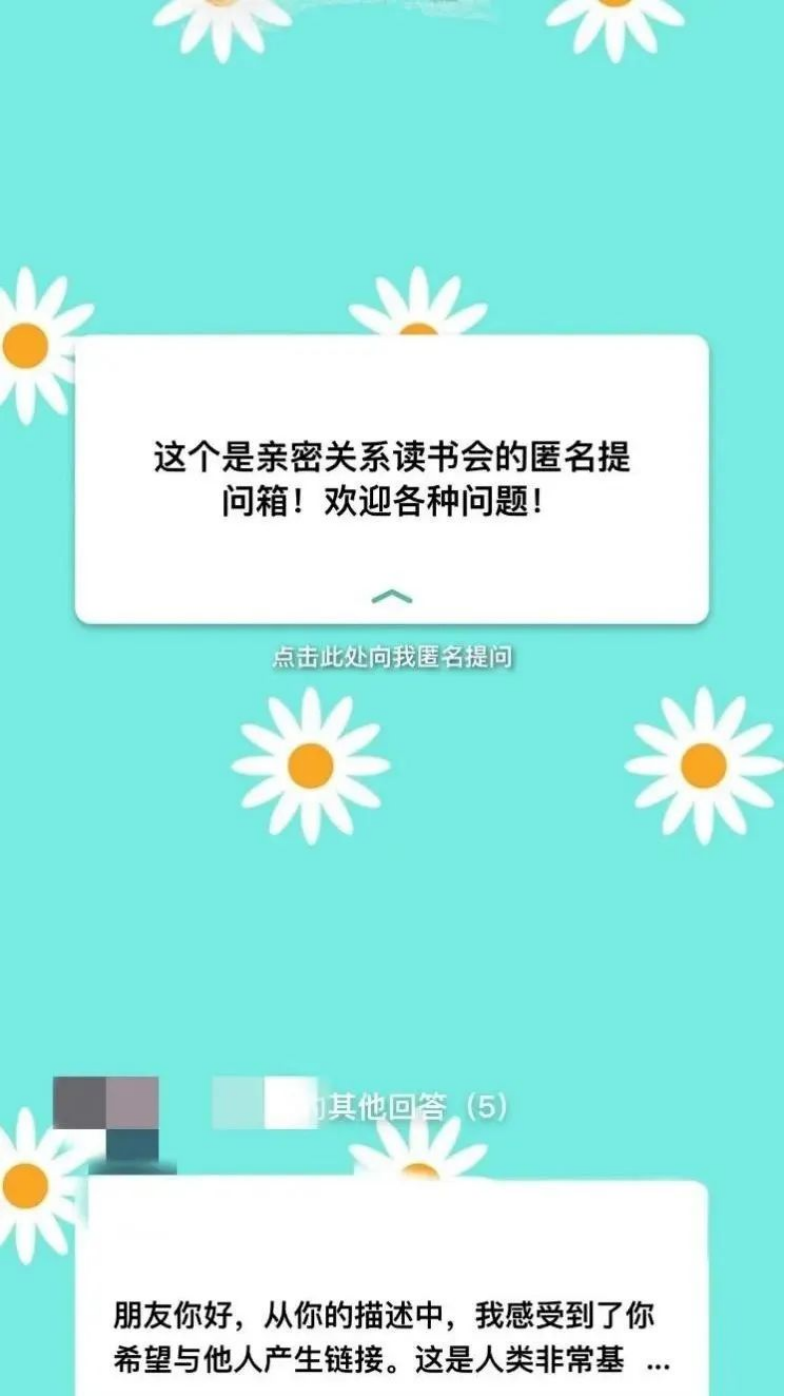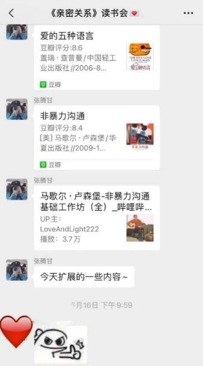 看到大家在读书会中收获满满,感到非常开心和满足!读书会不仅仅是一个亲密关系知识探讨的平台,也是大家分享经历、交流感受、相互支持的平台,每一个人的发言都能够得到认真的倾听与回应,能够和大家一次度过这六次读书会感觉非常荣幸!