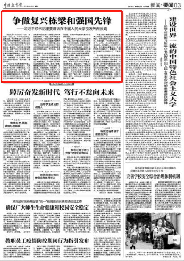 “习近平总书记高度肯定中国人民大学‘党办的大学让党放心、人民的大学不负人民’的精神品格,从在人文社会科学领域‘独树一帜’、推动中国特色哲学社会科学创新发展、建设高素质的教师队伍、培养堪当民族复兴大任的时代新人等方面,对学校今后发展提出了新的要求,饱含着对党亲手创办的第一所新型正规大学的殷切期盼。”中国人民大学党委书记张东刚说,“我们将把学习宣传和贯彻落实习近平总书记重要讲话精神作为当前和今后一个时期的重大政治任务,更加坚定自觉地构建以中国自主的知识体系为内核的中国特色哲学社会科学学科体系、学术体系、话语体系。”