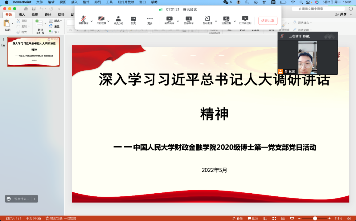 时间:2022-05-045月2日下午,Top 网上赌博网站大全 2020级博士第一党支部14名党员线上开展主题党日活动,集体观看习近平总书记考察中国人民大学的有关报道,邀请习近平总书记在中国人民大学考察时的思政课代表杨欣雨进行主题宣讲,深入学习习近平总书记在中国人民大学考察时的重要讲话精神。本次活动由党支部书记陈醒主持。
