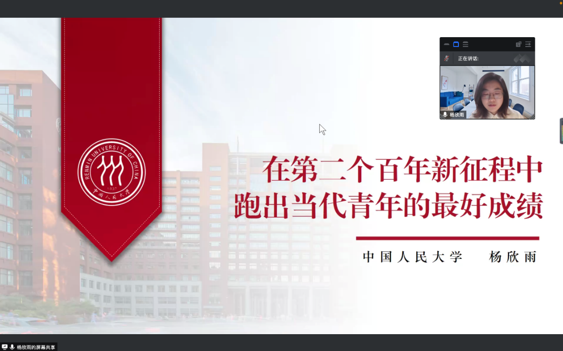 杨欣雨作“在第二个百年新征程中,跑出当代青年的最好成绩”主题宣讲,以现场参与者的视角讲述了习近平总书记来访时的感受。在思政课上,习近平总书记平易近人,就思政课教育、延安精神、青年成长等方面发表讲话,寄语青年在全面建设社会主义现代化国家新征程中勇当开路先锋、争当事业闯将。她表示,中国人民大学作为党创办的第一所新型正规大学,已跨越八十五载,一代代人大学子以实际行动践行着“请党放心,强国有我”的青春誓言。少年强则国强,党的百年奋斗史昭示着青年的历史使命与时代担当。作为中国人民大学的学生,要牢记习近平总书记嘱托,牢记党的教诲,立志民族复兴,不负韶华,不负时代,不负人民!