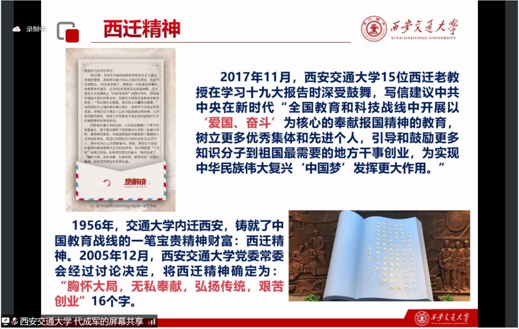 西安交通大学马克思主义学院硕1117班党支部书记代成军同志带领大家学习“西迁精神”的深刻内涵:核心是爱国主义,精髓是听党指挥跟党走,与党和国家、与民族和人民同呼吸、共命运。他表示,要牢记总书记发扬好西迁精神的嘱托,在新时代创造属于我们这代人的杰出贡献。