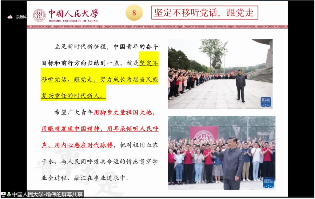 中国人民大学马克思主义学院博士生宣讲团讲师喻伟带领大家学习习近平总书记在中国人民大学考察时的重要讲话精神。一是思政课的本质是讲道理,要注重方式方法,把道理讲深、讲透、讲活,老师要用心教,学生要用心悟。二是继承优良传统,赓续红色血脉,加强校史资料的挖掘、整理和研究,讲好中国共产党的故事,讲好党创办人民大学的故事。三是必须要有世界一流的大师,要高度重视教师队伍建设,特别是要加强中青年教师骨干的培养,做好“大先生”。四是打造中国特色、世界一流的学术资源信息平台,精心保护馆藏红色文献,利用数字化方式让更多的人受到教育、得到启迪。五是扎根中国大地,走出一条建设中国特色世界一流大学新路,强调建设中国特色、世界一流大学不能跟在别人后面依样画葫芦,简单以国外大学作为标准和模式。六是以自觉回答中国之问、世界之问、人民之问、时代之问为学术己任。七是坚定不移听党话,跟党走,号召大家牢记党的教诲,立志民族复兴,不负韶华,不负时代,不负人民,在青春的赛道上奋力奔跑,争取跑出最好的成绩。