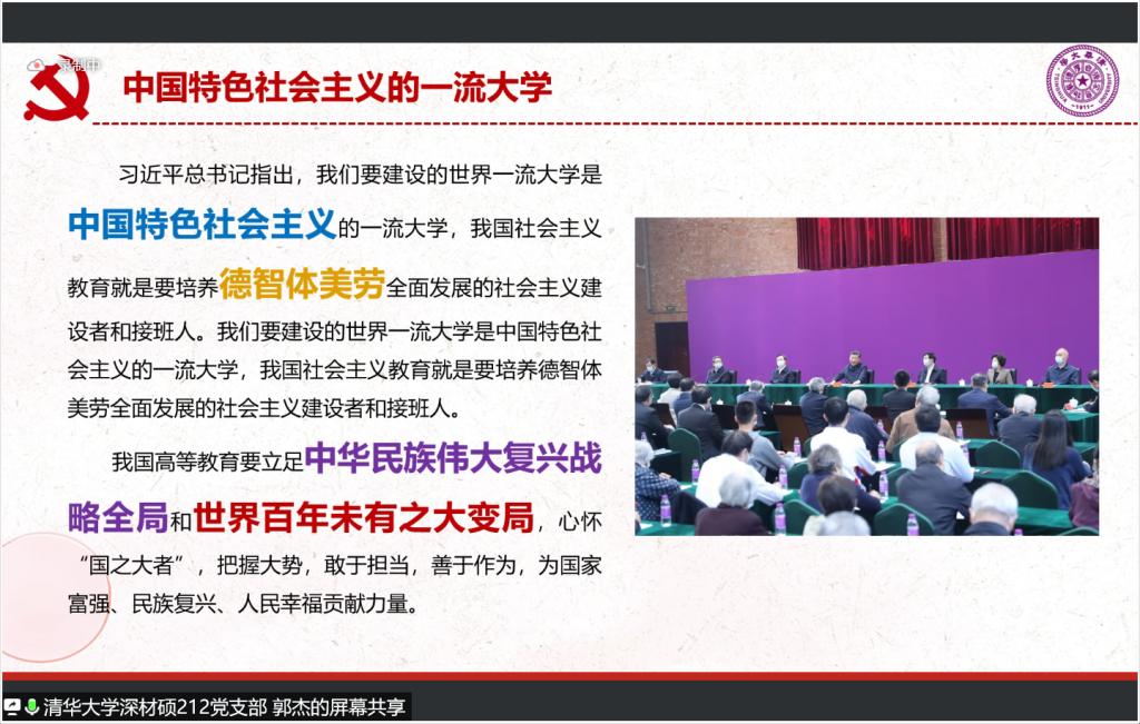 清华大学深材硕212党支部书记郭杰同志带领大家回顾了习近平总书记在清华大学考察的重要讲话精神。总书记提出,要建设的世界一流大学是中国特色社会主义的一流大学,我国社会主义教育要培养德智体美劳全面发展的社会主义建设者和接班人。广大青年要肩负历史使命,坚定前进信心,立大志、明大德、成大才、担大任,努力成为堪当民族复兴重任的时代新人,让青春在为祖国、为民族、为人民、为人类的不懈奋斗中绽放绚丽之花。